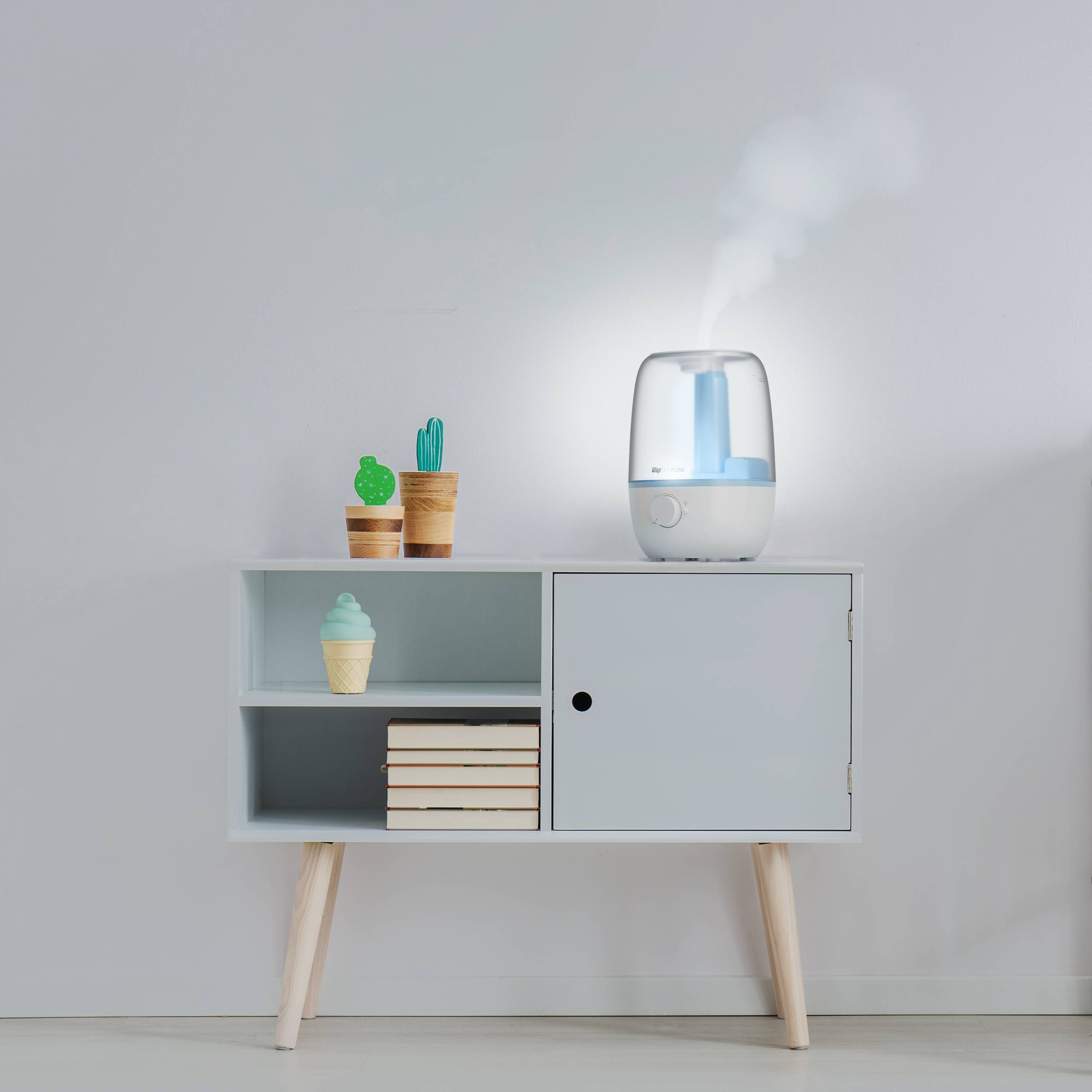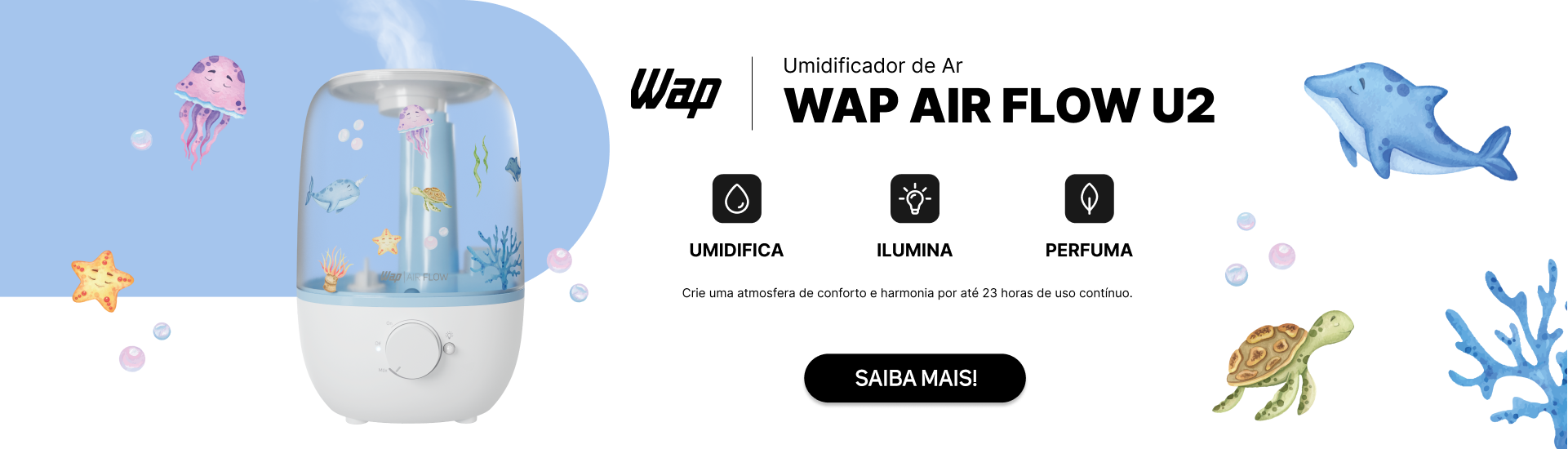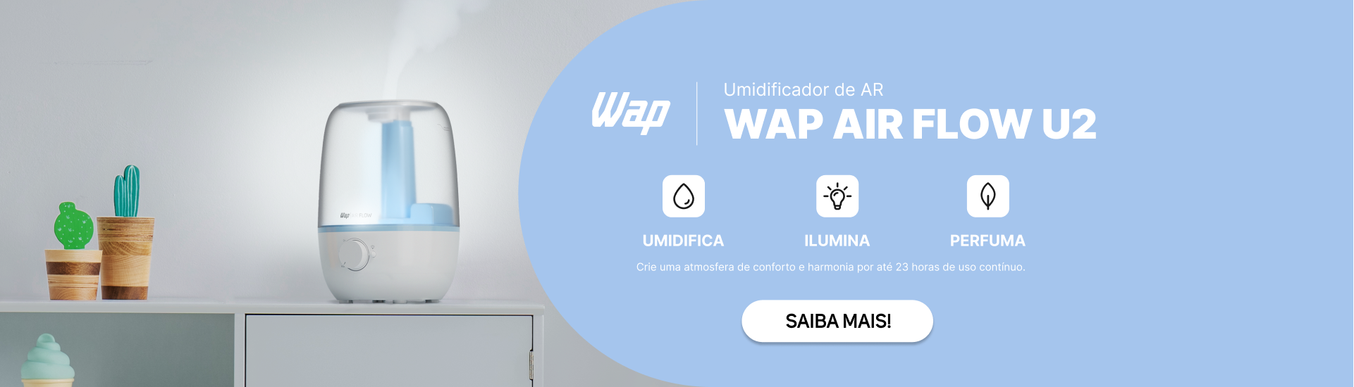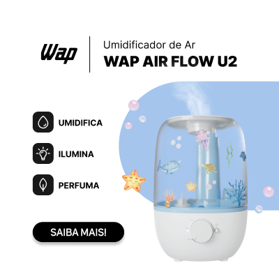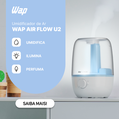 - Tenha poder três em um! O WAP AIR FLOW umidifica, perfuma e ilumina os ambientes da sua casa para mais saúde e bem-estar o ano inteiro.