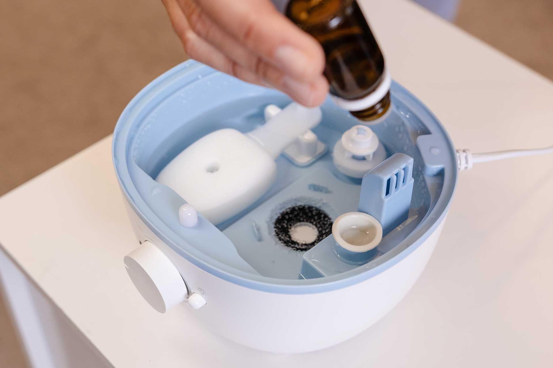- Aromatize ambientes com suas fragrâncias favoritas utilizando o reservatório para essências e óleos do AIR FLOW.