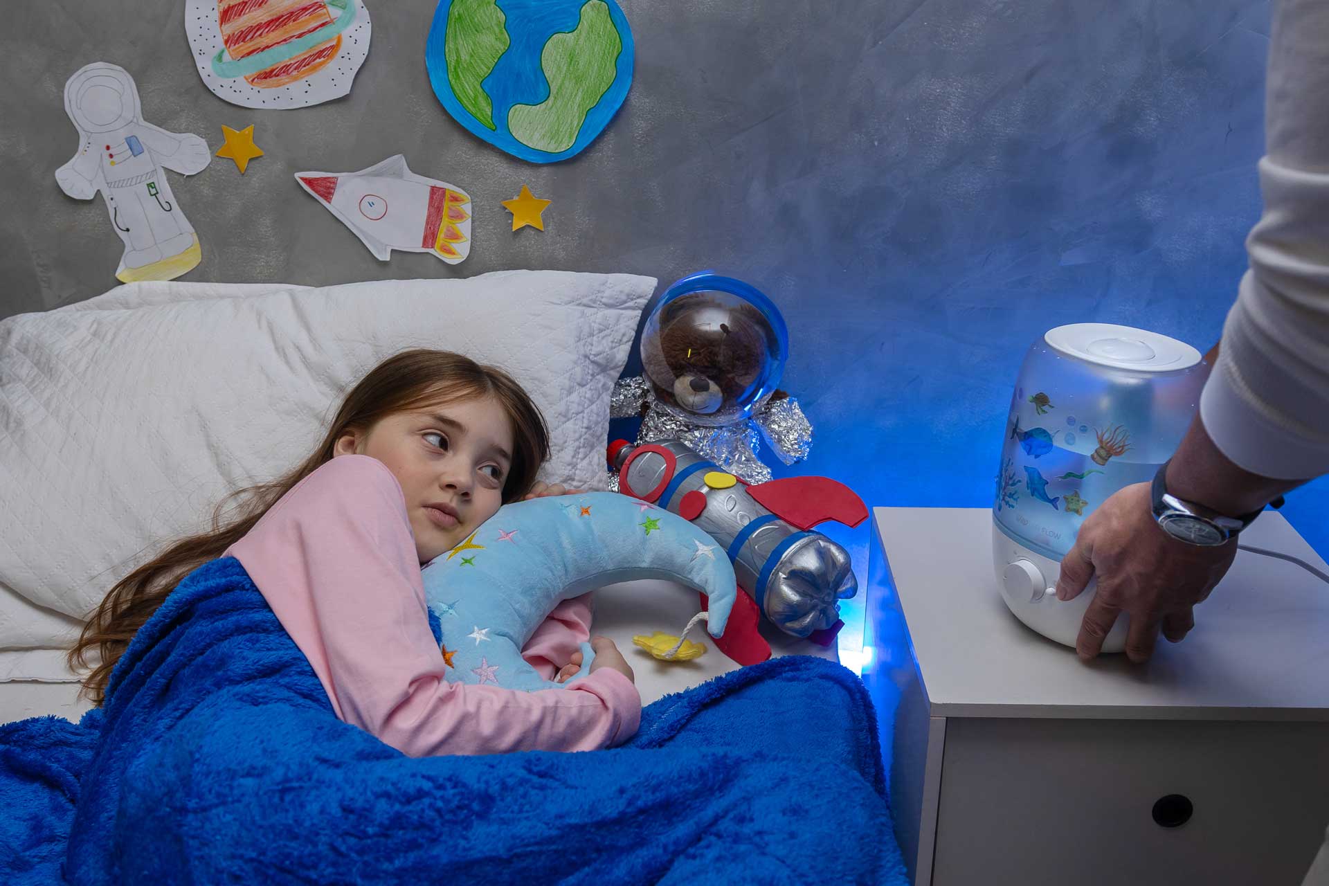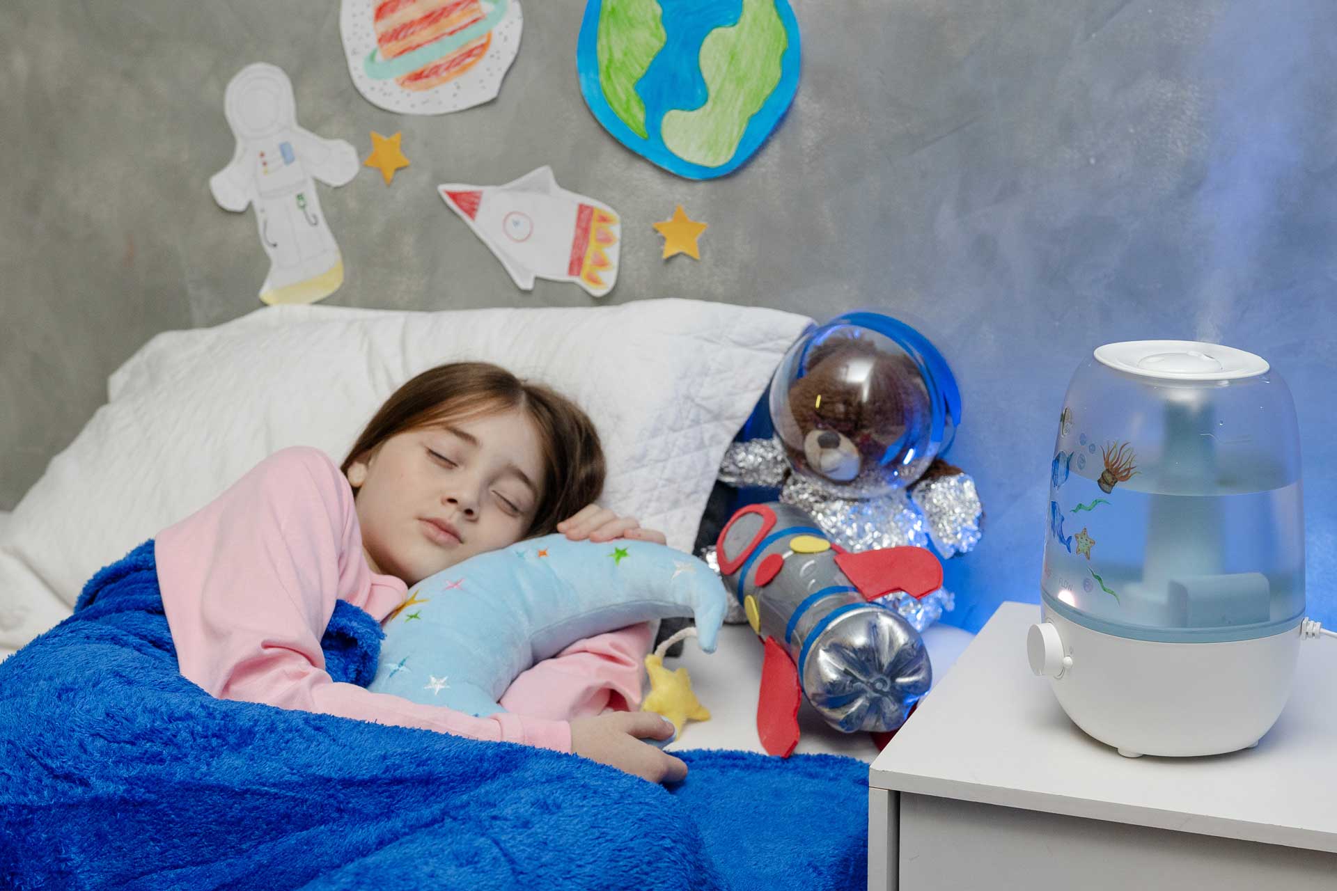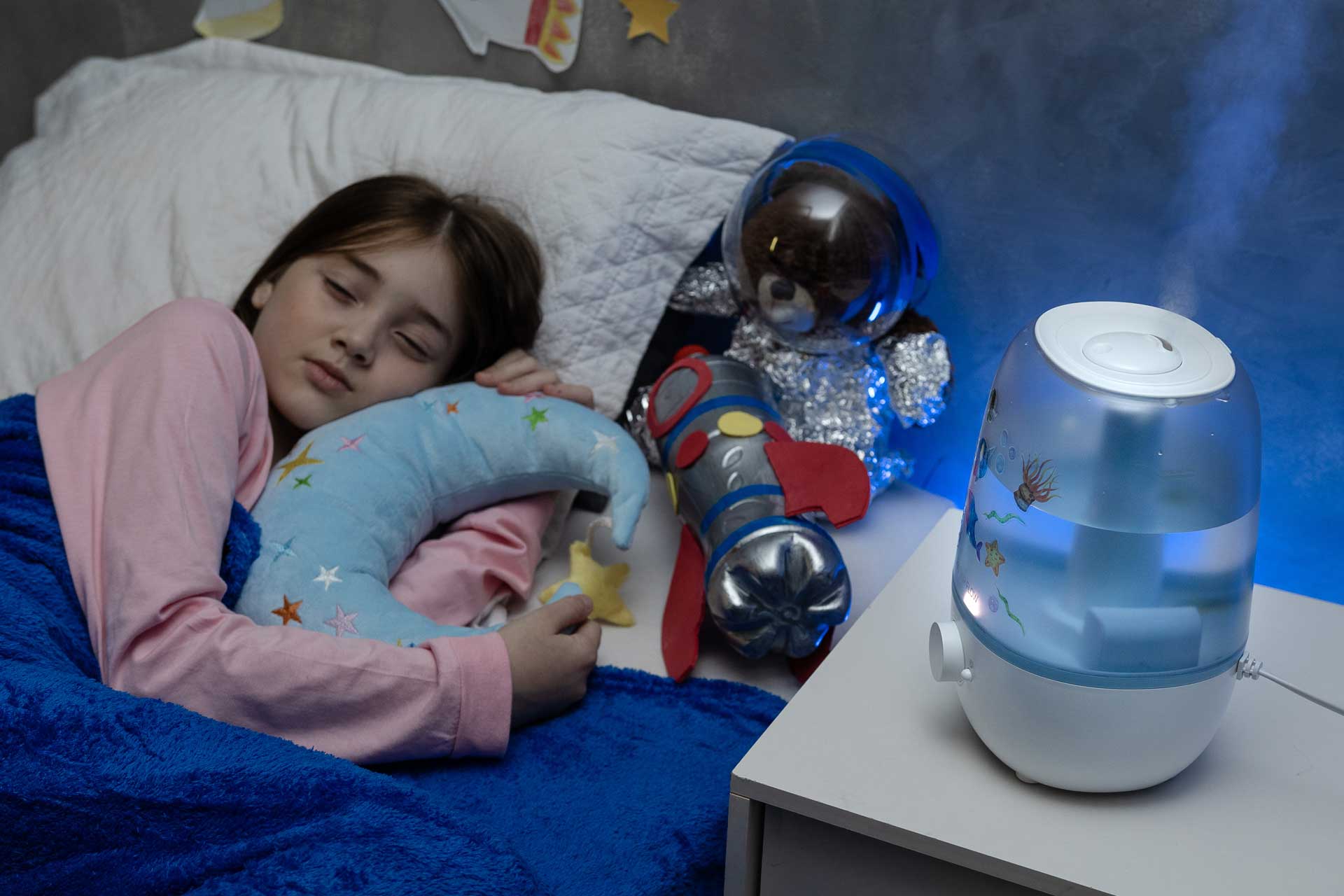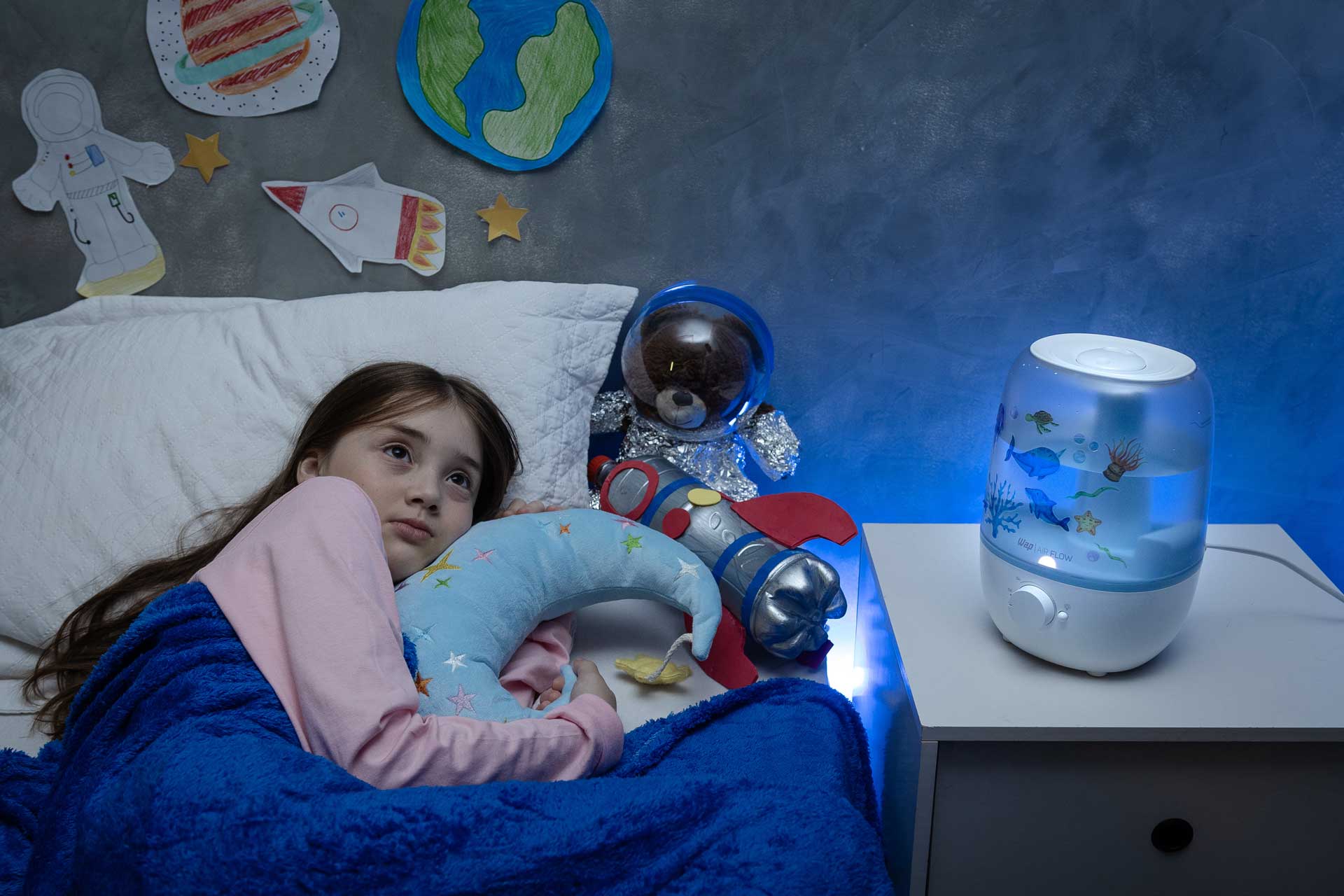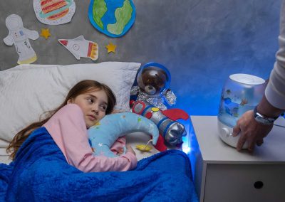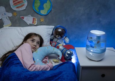 O umidificador ultrassônico também atua como luminária, proporcionando uma iluminação neutra e sólida para decorar os ambientes do seu lar. O AIR FLOW envolve as crianças na promoção de um ambiente saudável, com sua superfície customizável estimulando a criatividade ao colar adesivos divertidos autocolantes.