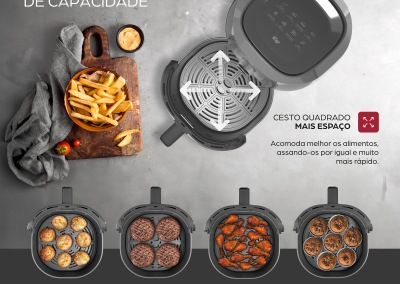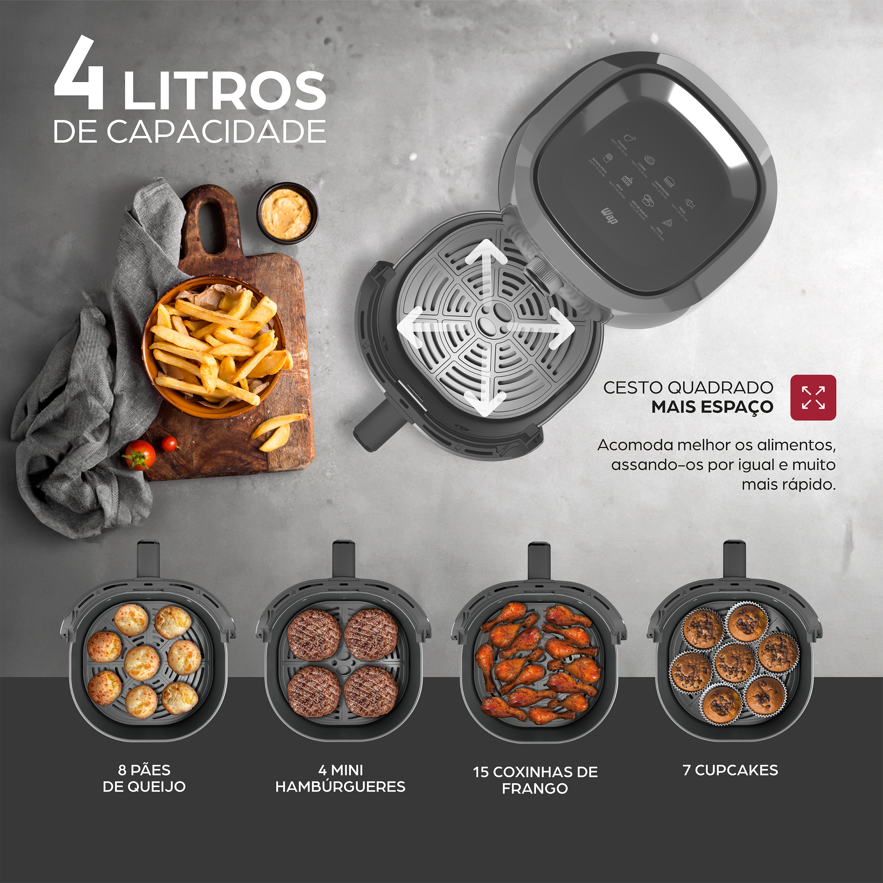 - Tenha mais espaço e mais sabor! O design quadrado do cesto da air fryer 4L WAP adiciona um toque moderno e maximiza a capacidade, permitindo que você prepare mais alimentos de uma só vez.