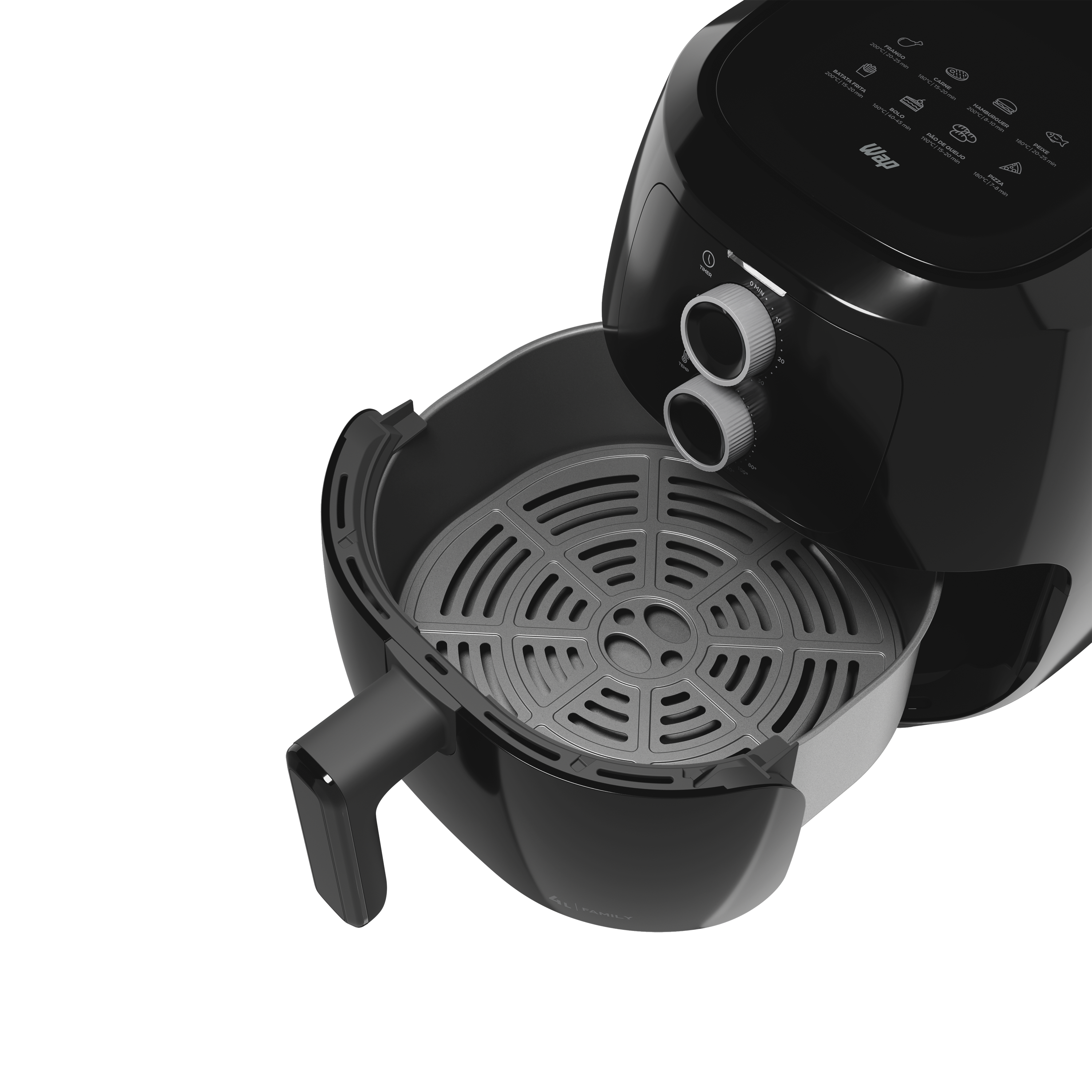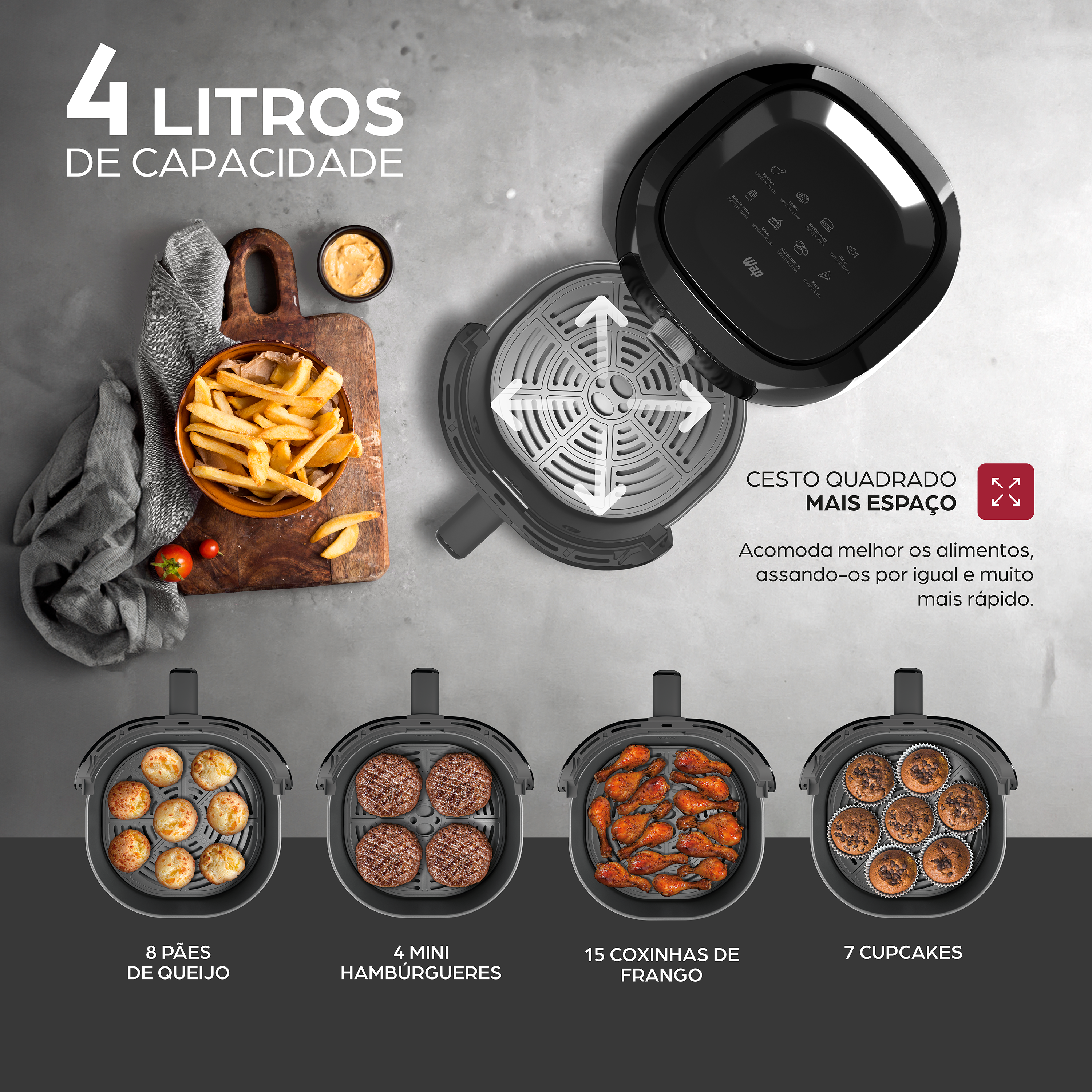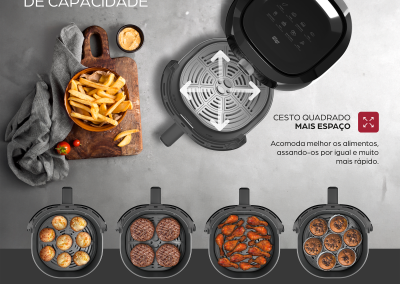 - Tenha mais espaço e mais sabor! O design quadrado do cesto da air fryer 4L WAP adiciona um toque moderno e maximiza a capacidade, permitindo que você prepare mais alimentos de uma só vez.