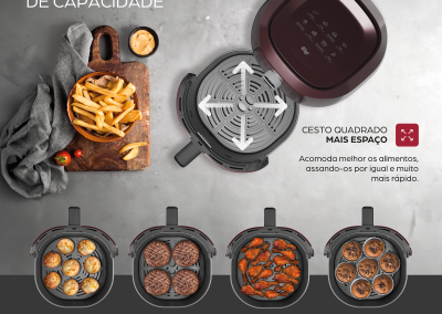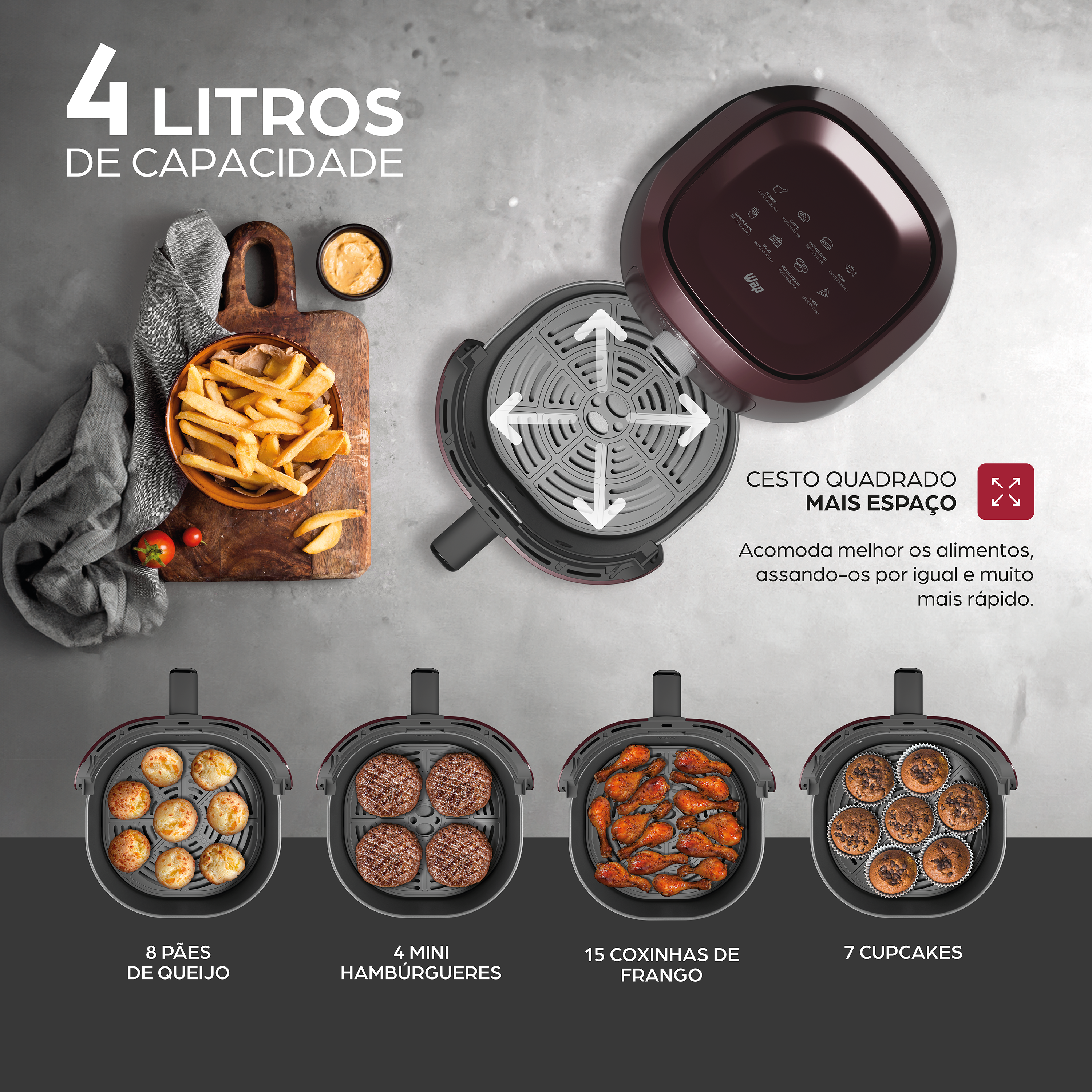 - Tenha mais espaço e mais sabor! O design quadrado do cesto da air fryer 4L WAP adiciona um toque moderno e maximiza a capacidade, permitindo que você prepare mais alimentos de uma só vez.