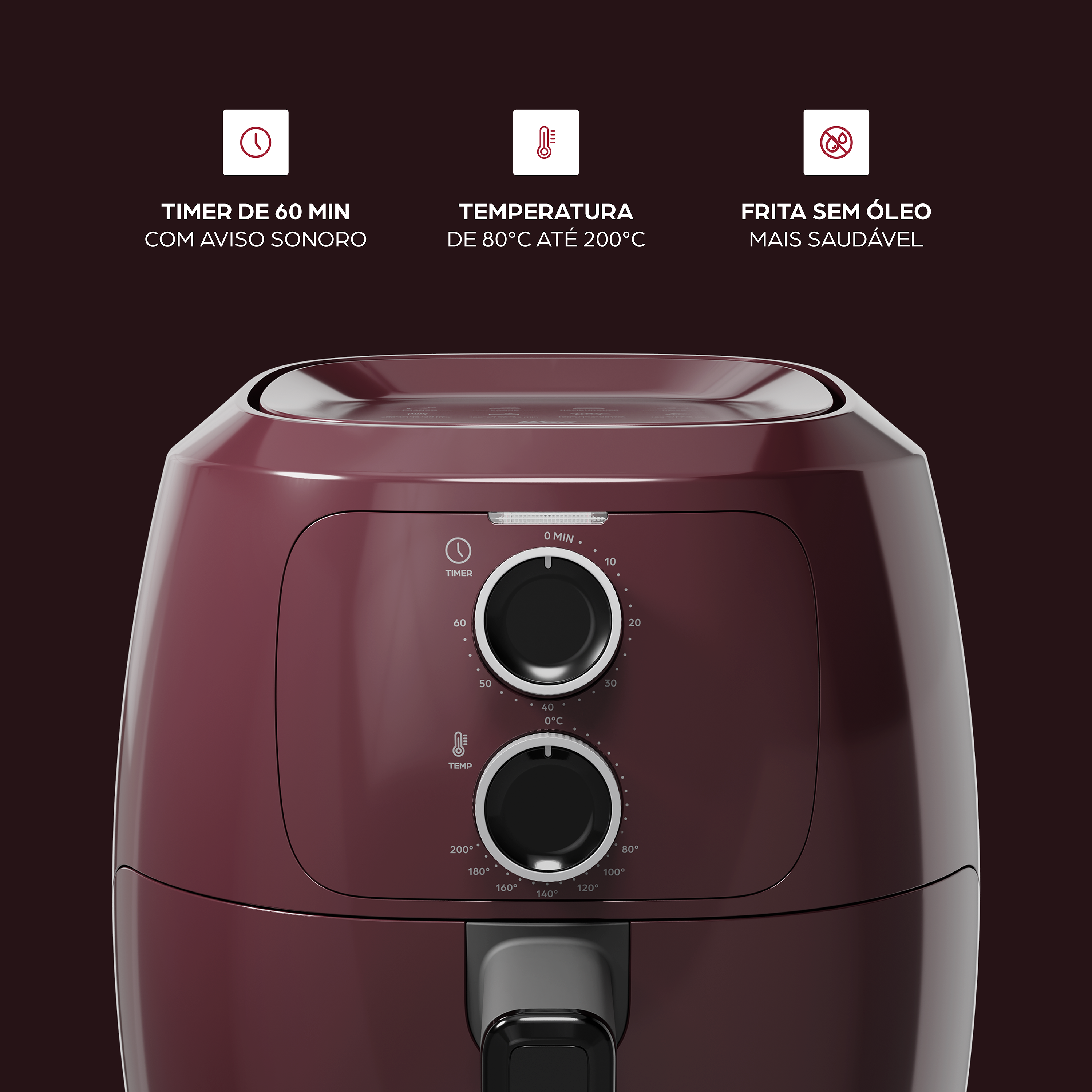 - Ajuste a temperatura de acordo com a sua receita! Com uma amplitude que varia de 80°C até 200°C, a fritadeira elétrica é a sua parceira em todas as aventuras culinárias.