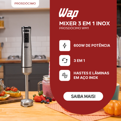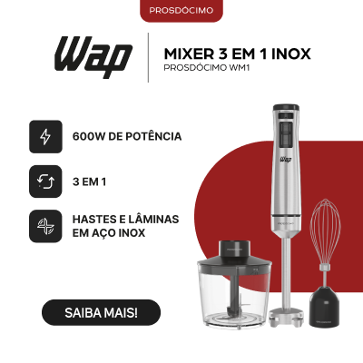 Desperte o chef que há em você com a versatilidade e a potência do WAP MIXER 3 EM 1 INOX PROSDÓCIMO WM1. Com potência de 600W (127) ou 1000W (220V) e design 3 em 1, você pode bater, triturar e processar alimentos com facilidade, utilizando um único aparelho, sem perder o sabor original de cada ingrediente.