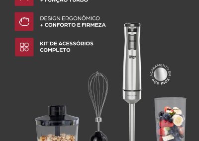 - O design ergonômico do corpo do mixer 3 em 1 WAP é projetado para proporcionar mais conforto e segurança durante o uso.